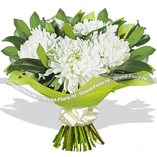 Элегантный букет из белых хризантем - это классическое цветочное произведение, которое никогда не потеряет своей актуальности и всегда будет радовать изысканной и такой нежной красотой.